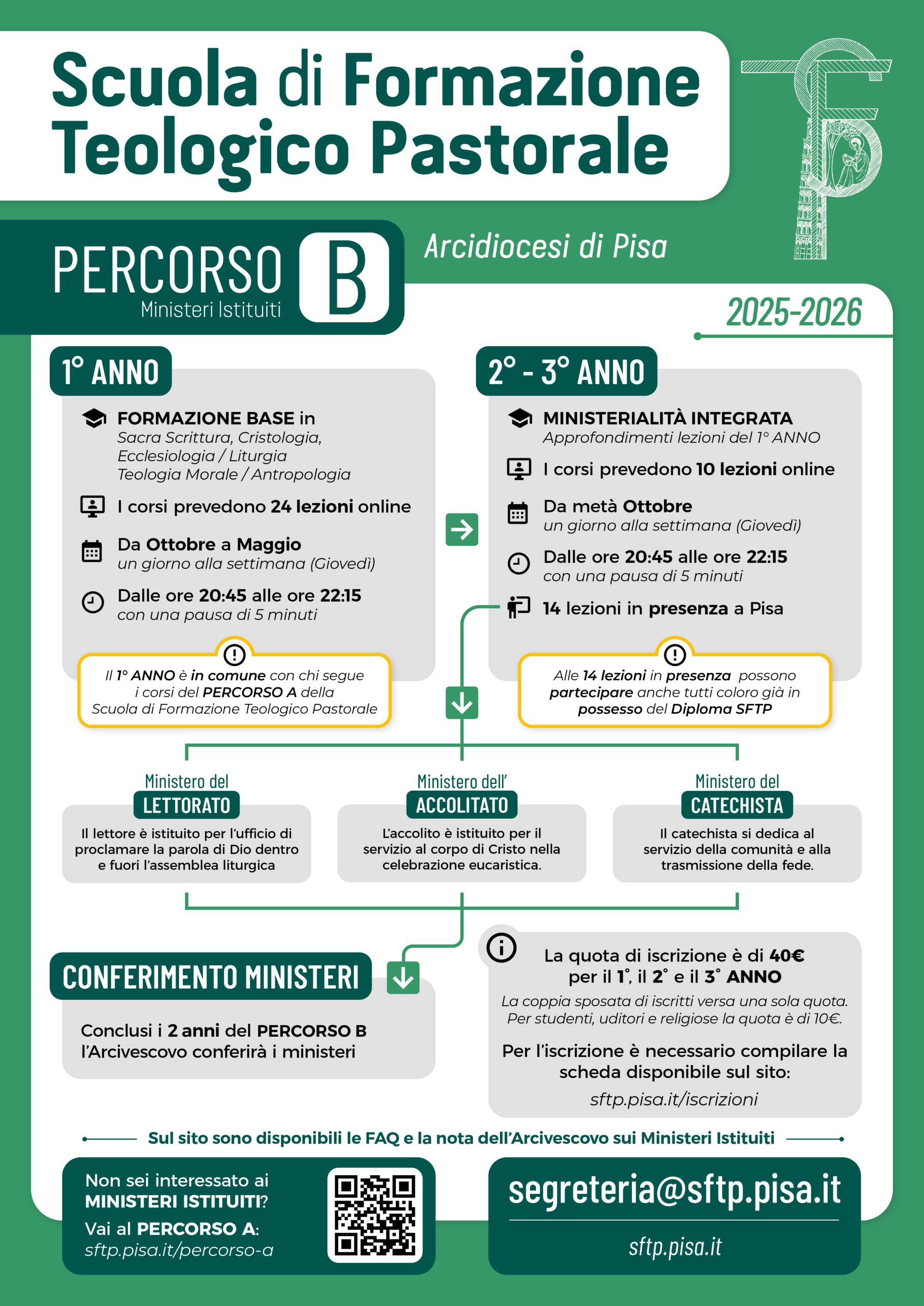 La Scuola di Formazione Teologico Pastorale (SFTP), articolata nelle quattro sedi diocesane (Barga, Pietrasanta, Pisa e Pontedera, propone anche quest’anno un percorso comune articolato in un primo anno di base dove saranno offerte lezioni online sulla Sacra Scrittura, Cristologia, Ecclesiologia / Liturgia e Teologia Morale / Antropologia.